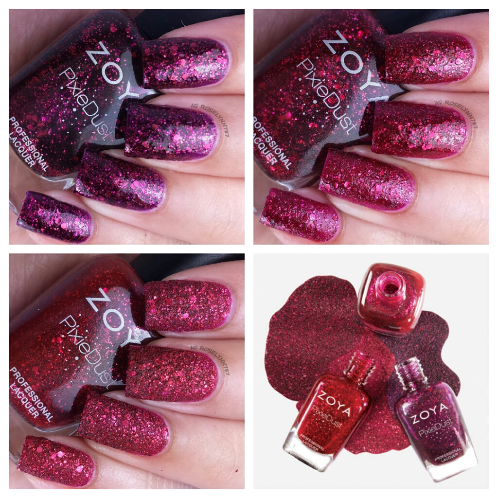 Meet the next generation of our best-selling textured, matte and sparkling Zoya PixieDust formula ­ Zoya Ultra PixieDust! Three shades featuring both fine micro glitter and mega hex particles for tone on tone 3D effects. This easy glam nail is available in 3 shades in a gradient of red, wine and plum hues. No base or top coat required.